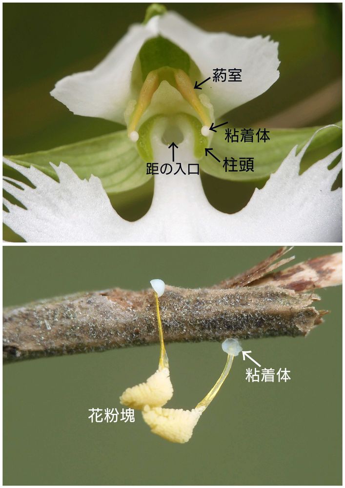 ラン科植物の受粉方法は独特です。葯室に花粉が多数塊となって入り、先に粘着体とよばれる白い部分があります。虫が距に溜まった蜜を吸おうと入り口に頭をつけると、背中あたりが白い粘着に触れます。すると、粘着体が虫にひっつき、花粉塊が葯室から抜けて虫に運ばれます。別の花の蜜を吸おうとした時、花粉塊が柱頭に触れ、受粉が成立します。白い粘着体に枝などを当てると、引っ付いて花粉塊がスポッと抜けます。