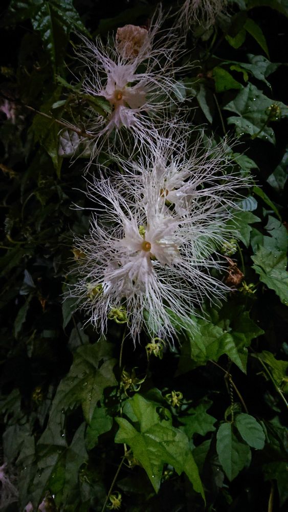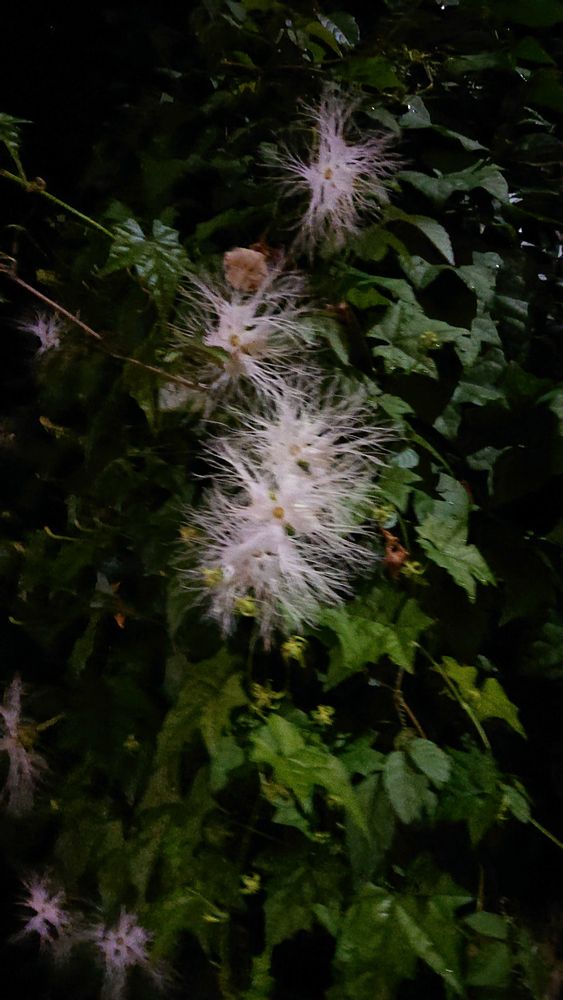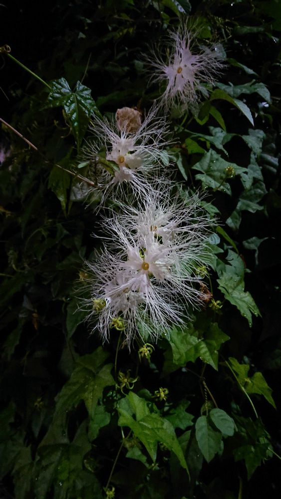👀夜でも白い花と葉っぱでカラスウリ🌿解るんだけど、葉に毛が生えてる とかまでは見えないので😣💦 色々な所で探したのですが!キカラスウリばかりでした~(T-T)💧~🌿👻