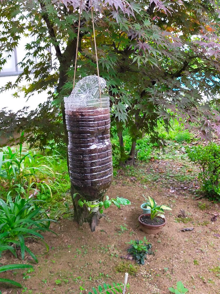 摘み取ったトマトの脇芽を根出しして、7月10日にYouTubeで見たペットボトル吊り栽培に挑戦。