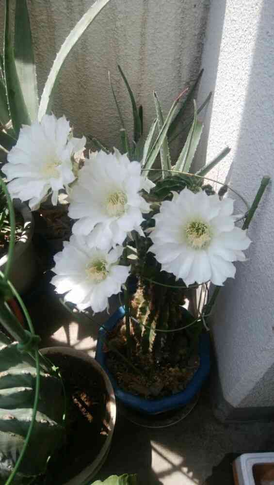 大きなサボテン🌵、大きな花、見事ですね😁暑いと余計に白が爽やかに映えます!