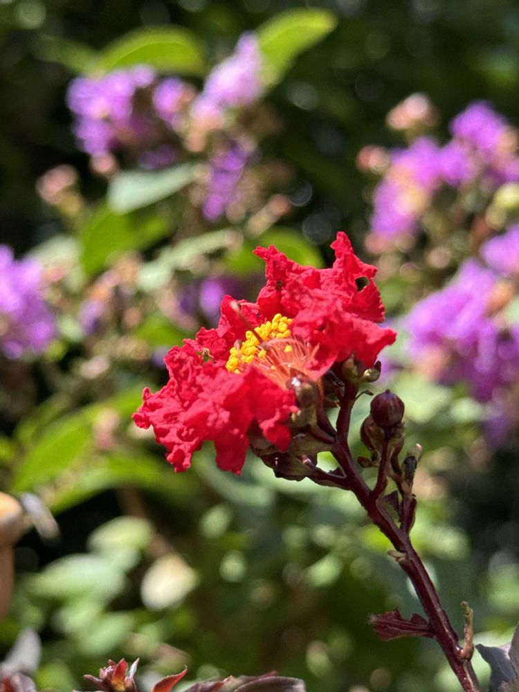 百日紅の黒葉が咲きました。去年買って家で咲くのは初めて。後ろの藤色は花後剪定して2回目。