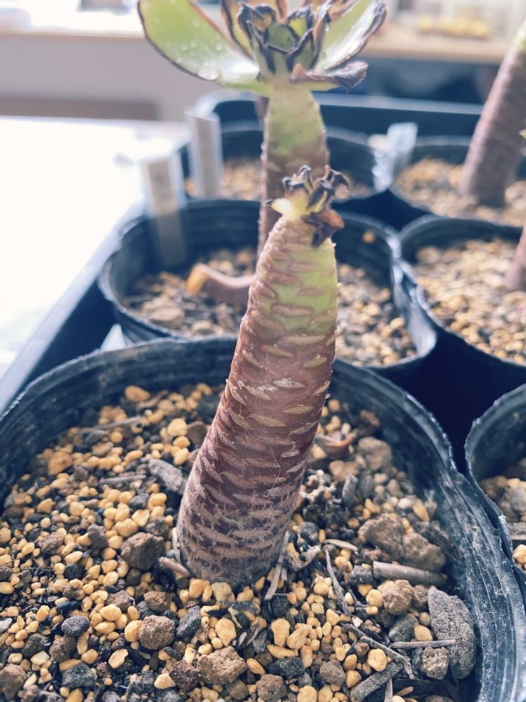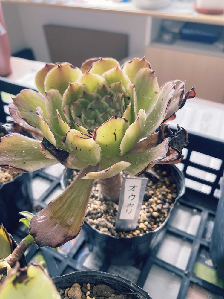 ハウス内暑かったので、アエオニウムのオウカリさんを日陰に置いておいたら、えっ⁉️(´・ω・)ナニコレ の姿になってしまっていました (т-т)