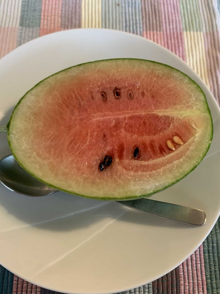 3日連続で今年最後の小玉スイカ🍉4つを収穫しました。なぜか7月31日と8月1日に集中して着果したので、GSさんを真似て25日で収穫してみました。高温続きで、甘い👍