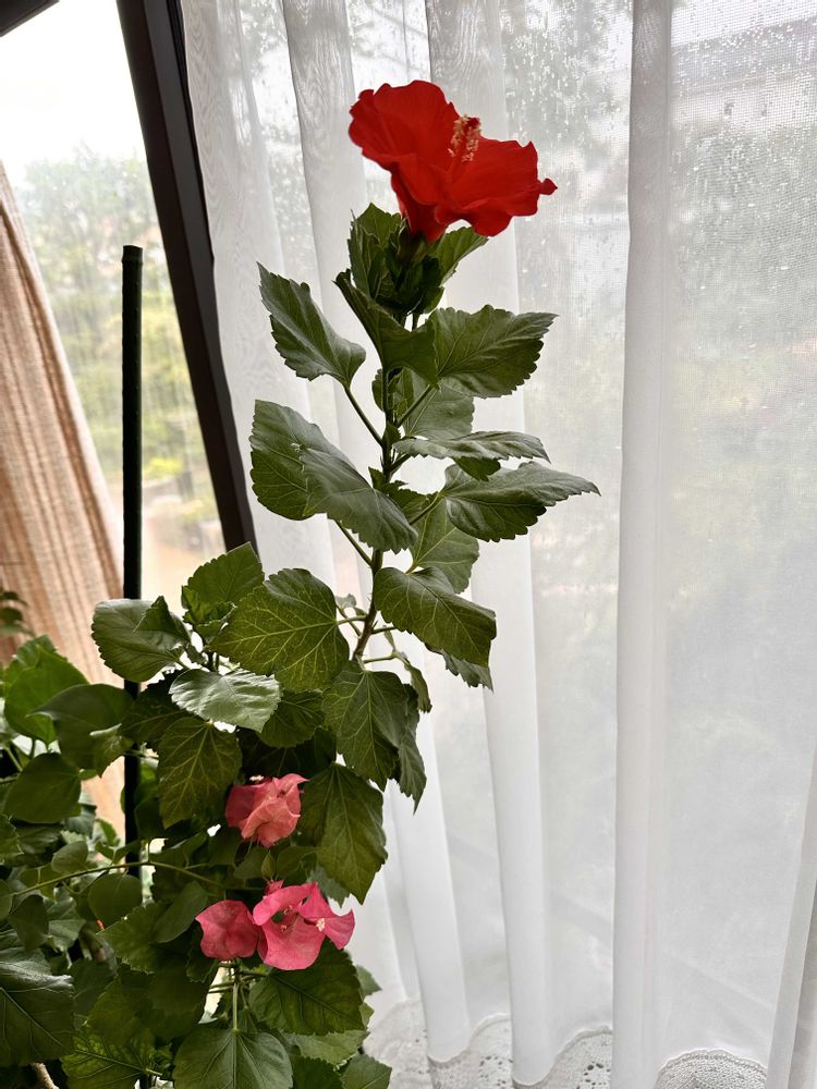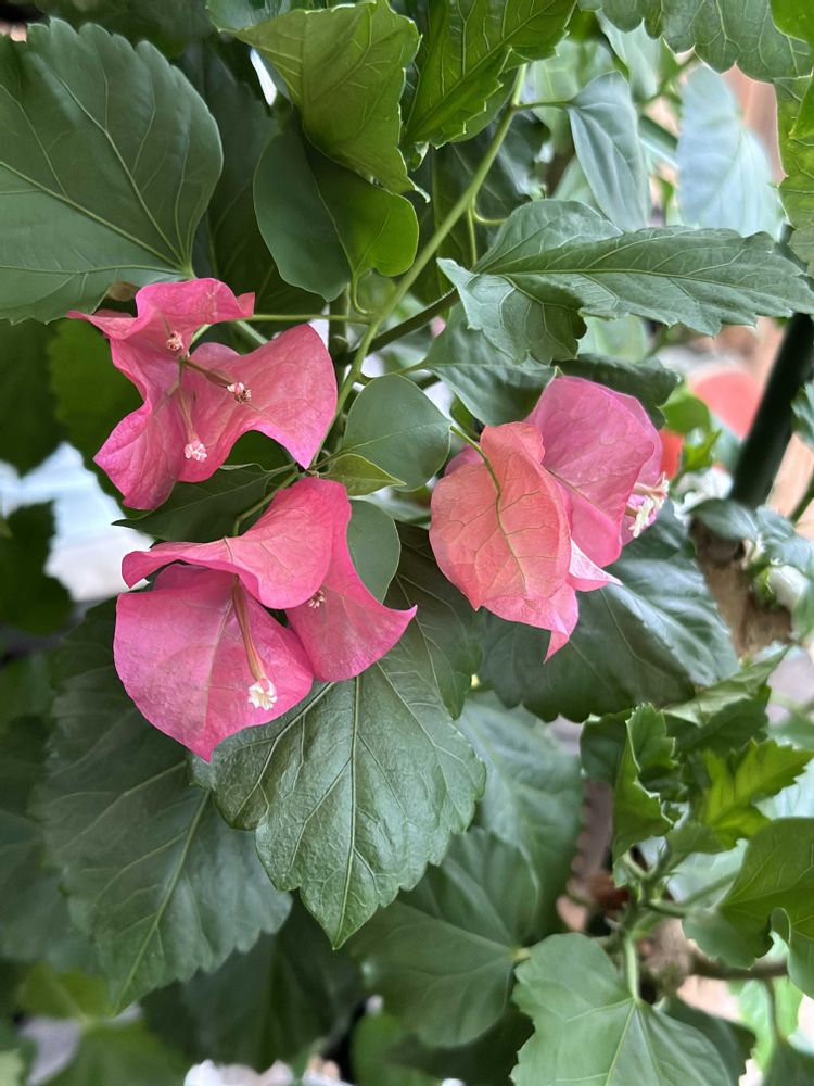 隣の鉢のプーゲンビリアの花がハイビスカスの葉っぱの間から顔を出した❤️