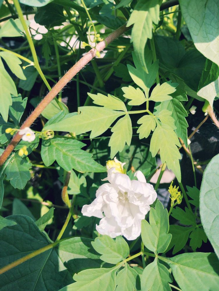 フウセンカズラと八重の白い朝顔の共演が可愛い♥️
