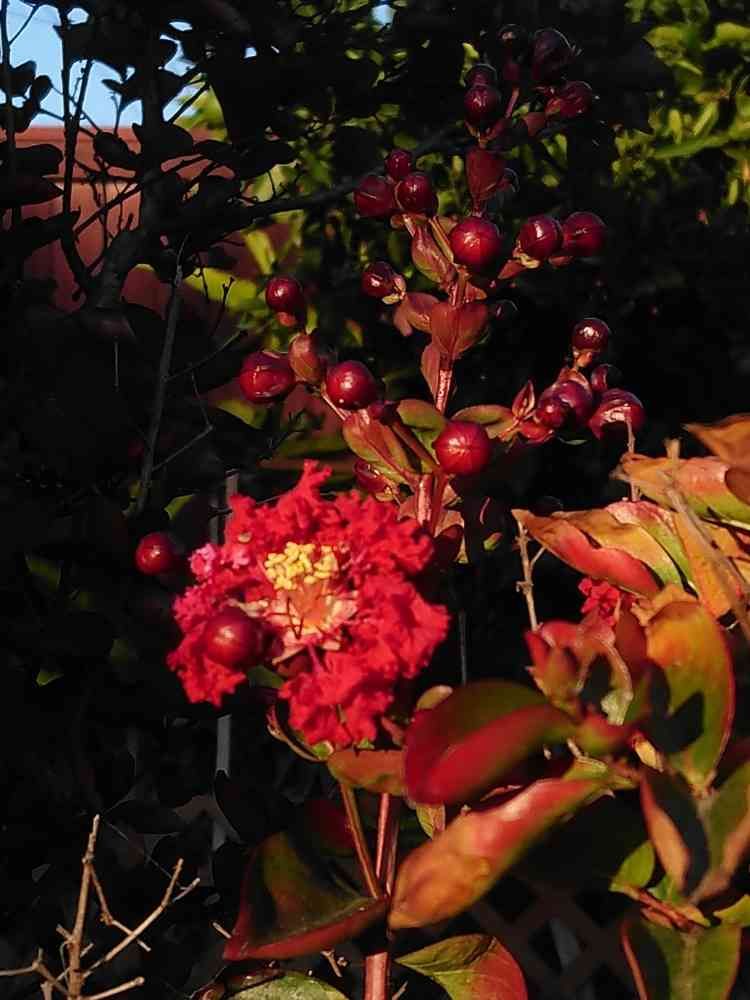 葉っぱも枝も赤いこのサルスベリは我が家に苗木で来て15年の長老組ですが、気難しいところがあり、成長とともに庭の場所での好き嫌いが変わりました。この場所で多分5〜6回目の引っ越し😅。主人がシャベル片手に「ここが嫌いだったら、もう出て行って貰いますからね」と言いながら移動させて3年ですが、今のところサルスベリさんからクレームは出てません。花も沢山咲くようになりました〜😆。