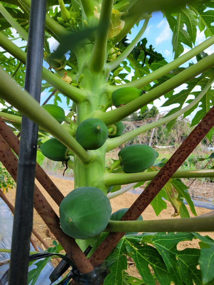 で、風も強くなると倒されそうなので、つっかい棒をした青パパイヤ。だいぶ育ってきました。