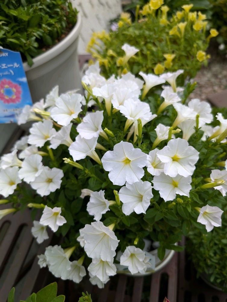 白のペチュニア、清涼感あって良きです😊中心部の薄い黄色も良いアクセントになってますね👍