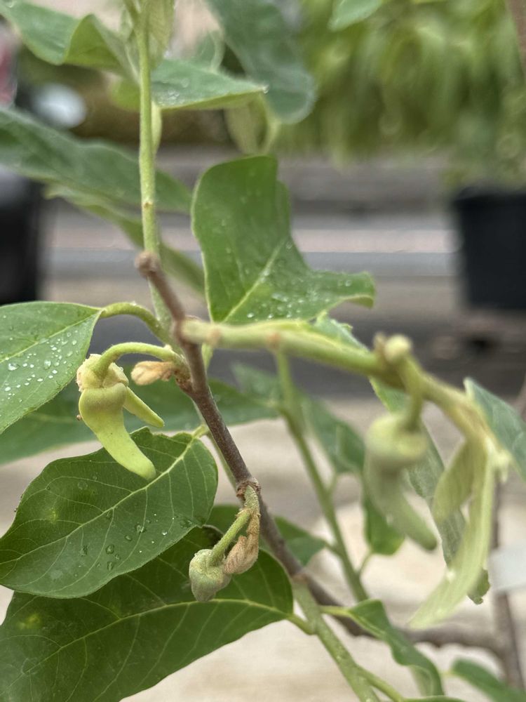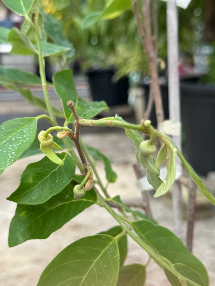 アテモヤ ジェフナーの苗が本日届きました。2年生とのことですが、既に花芽があり、試しに人工受粉にチャレンジしてみました。