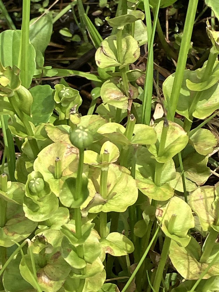 ②茎葉が可愛いです。円い葉が段々になって茎を抱いてます。蕾も見えますね。ん?花が折られたのかな?