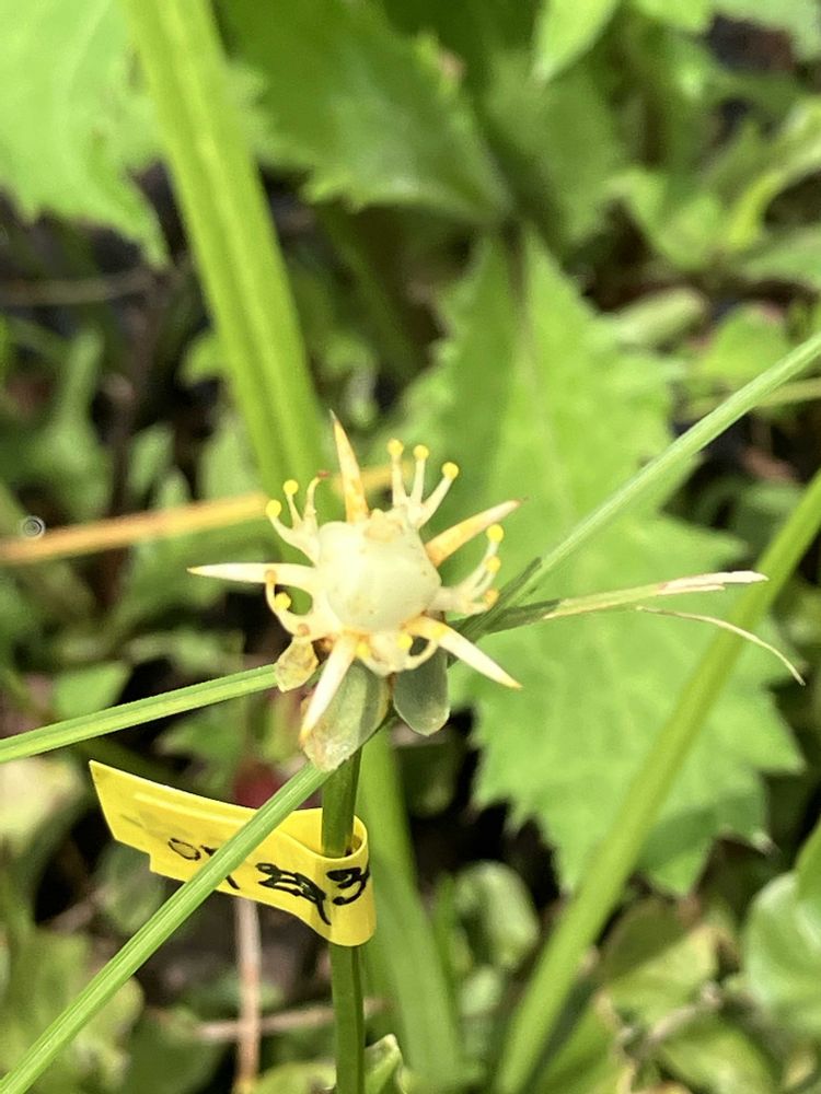 ④花後です。某大学が研究中らしく茎にタグがついてました。役目を終えた5本の雄蕊が全開し、雄蕊と雄蕊の間には3裂した仮雄蕊があります。子房の天辺に柱頭がぼんやりと見えますね。花の作りがそっくりの花を思いつきませんか?