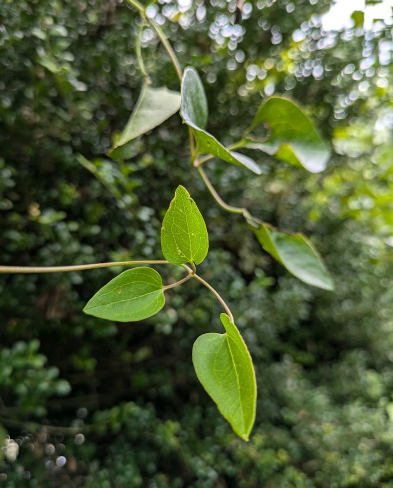 庭の生け垣に絡みついていたツルに蕾がついたと思ったら、雨上がりに一気に花が開いた♡ ボタンヅルと違って蕾の先は尖っていて、ちょうどクモが巣をかけていた (2枚目)