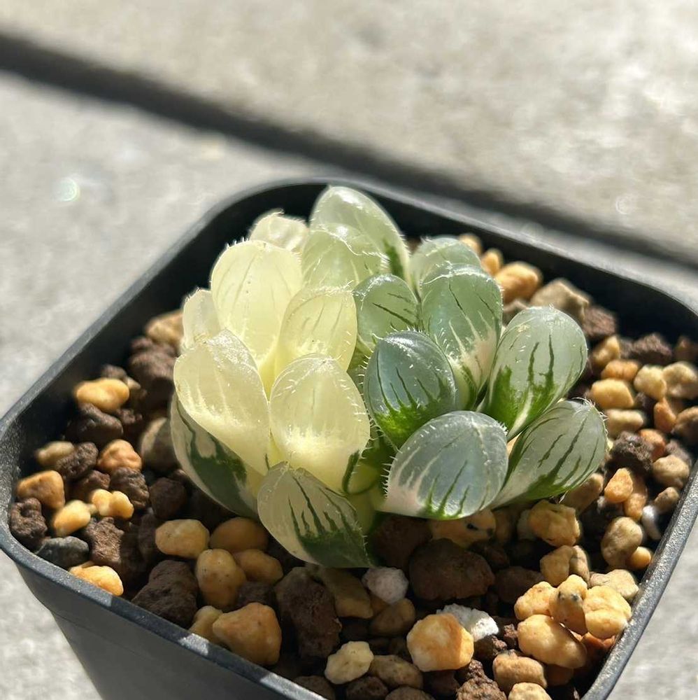 ハオルチアの斑入り品種です。大きめで明るい窓と、青光りが特徴です。