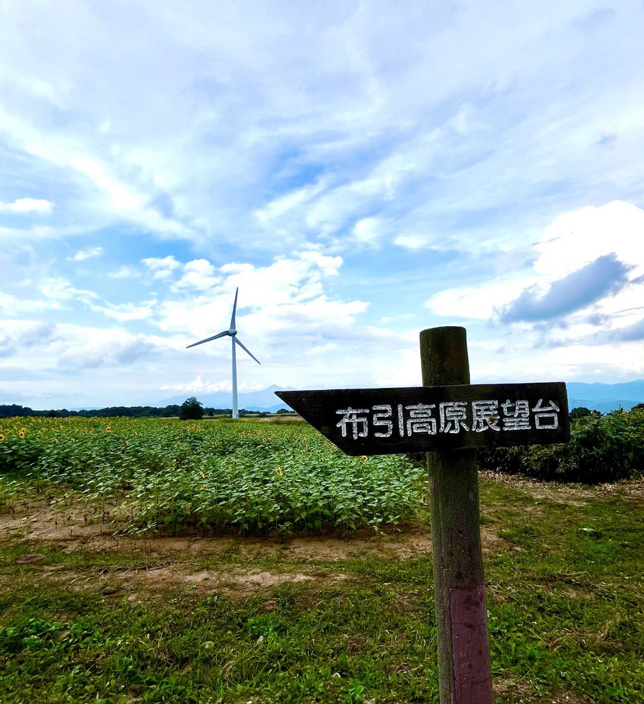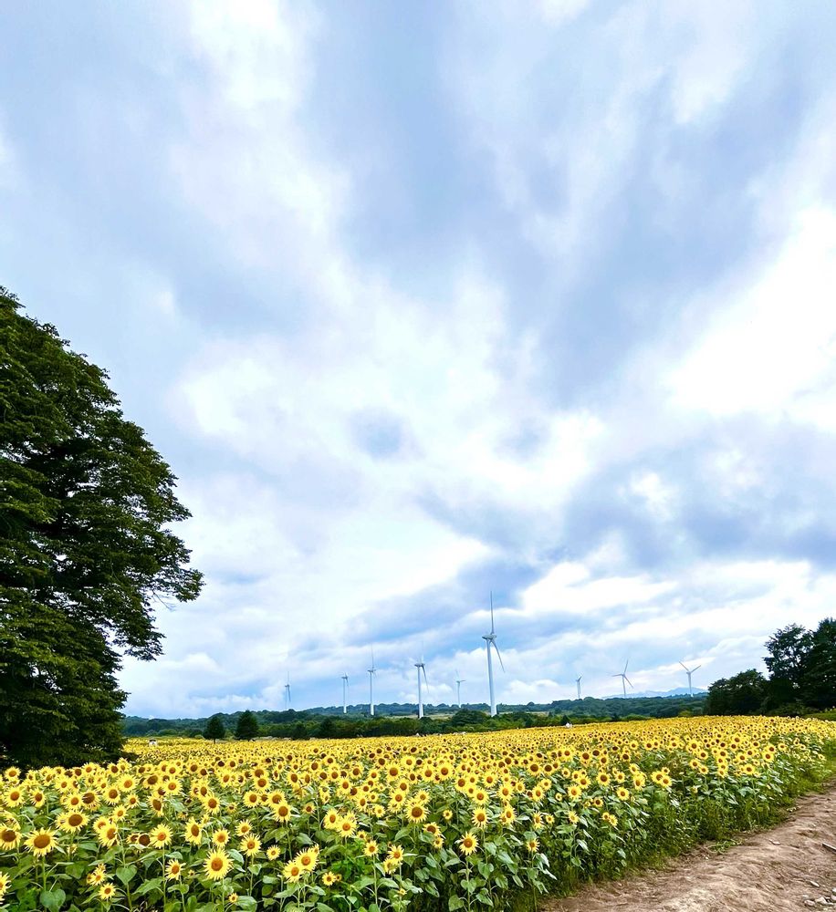 東京ドーム49個分の広大な敷地に、高原の風を受けてゆっくり回る日本最大級の風力発電の33基の風車と約180万本のひまわりの花を楽しめる。