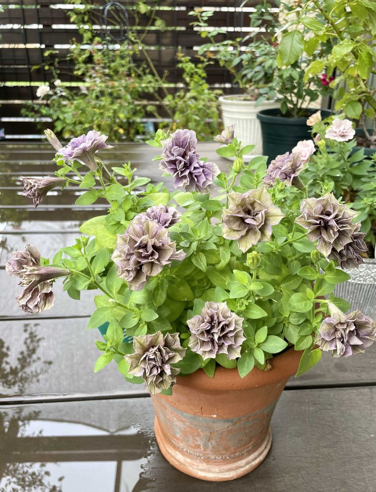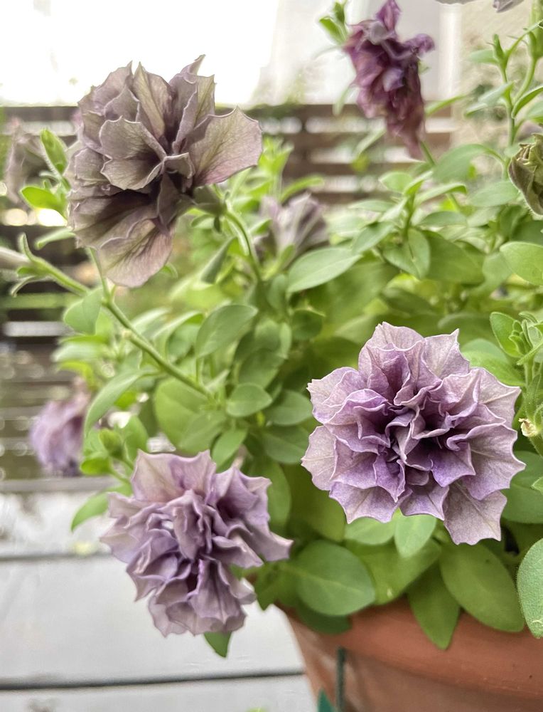 写真はアンティークな八重咲きペチュニア💜ラベルがなくなり名前が分かりません。お迎えした時はこんな渋い色をなぜ買ったんだろうと思いました。でも雨の日にはこの渋い紫色がとてもお洒落に見えて、今は気に入ってます😅