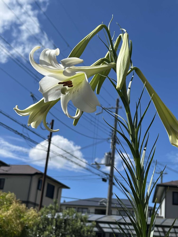 青空に鉄砲ユリが意気揚々と開花を……😍