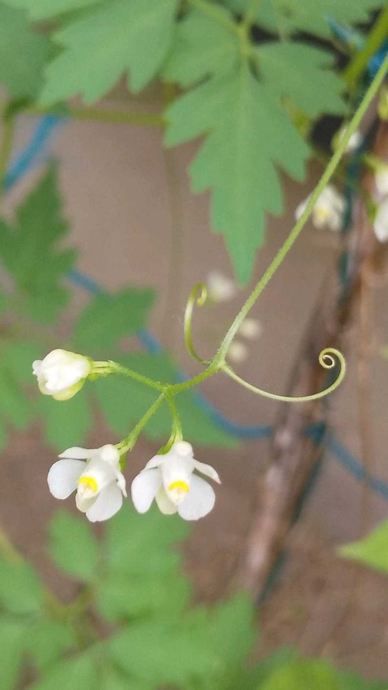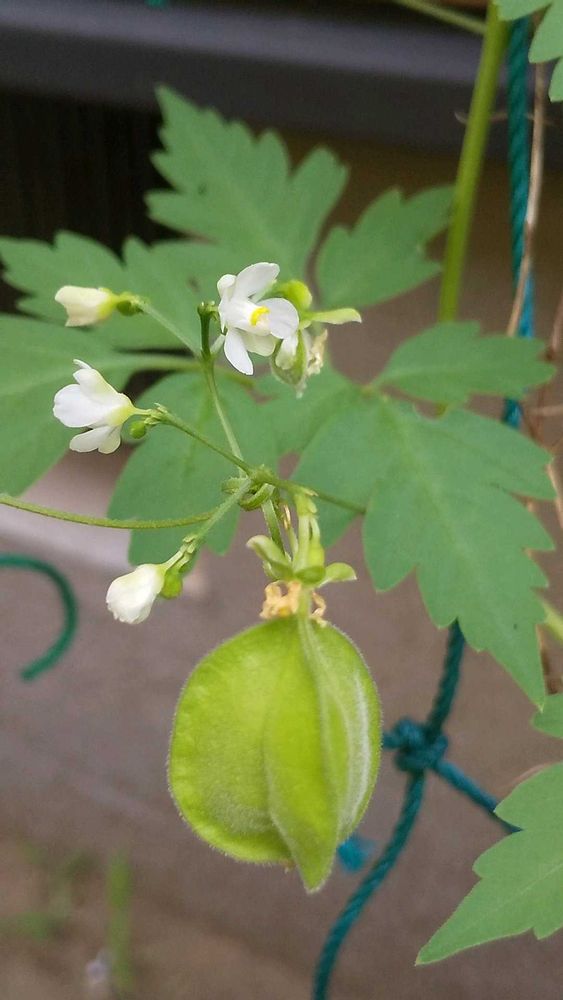 朝顔の葉と葉のクビレから顔を出したフウセンカズラの花が顔みたい🤭