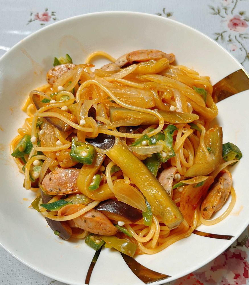 冷蔵庫の中にあるもので何作ろうかと考えて、主人がスパゲッティ食べたいというので、チャッチャと作りました。もう秋なんですが、夏野菜スパゲッティです🍆🫑