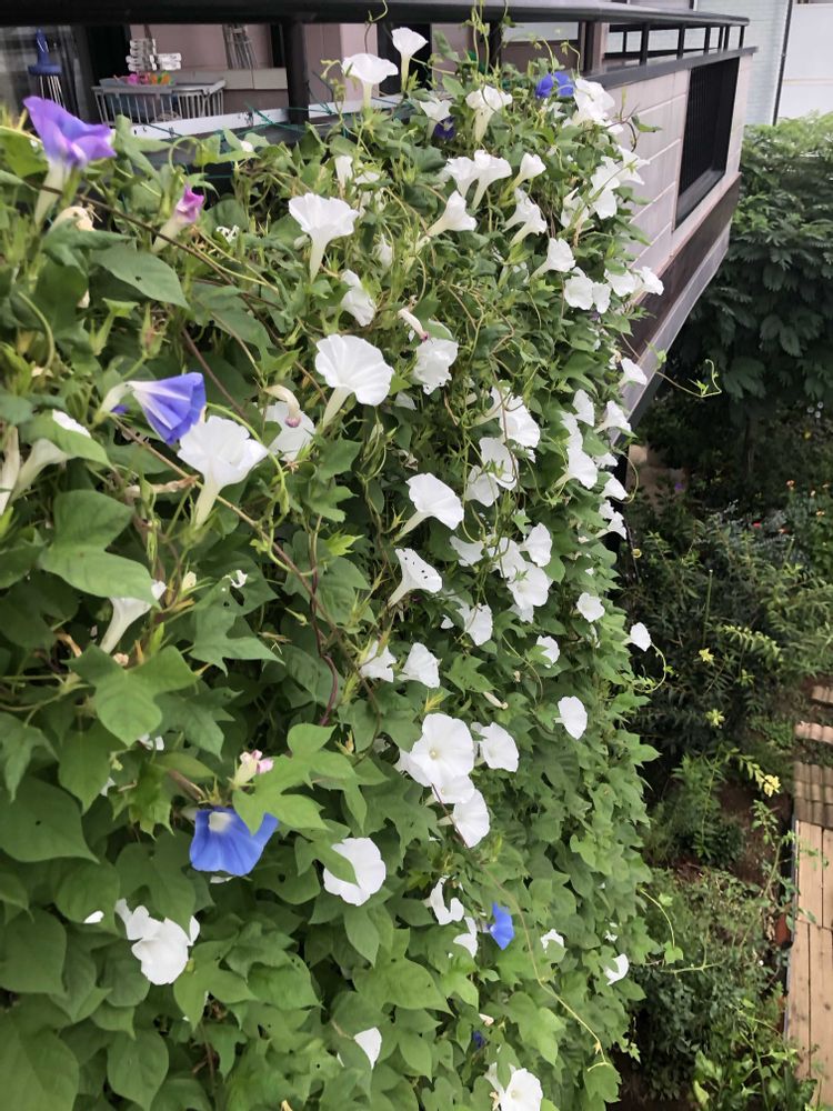 ベランダまで駆け上がる朝顔が一斉に咲き出しました。零れ種で毎年勝手に生えて来る野良朝顔🤍💙