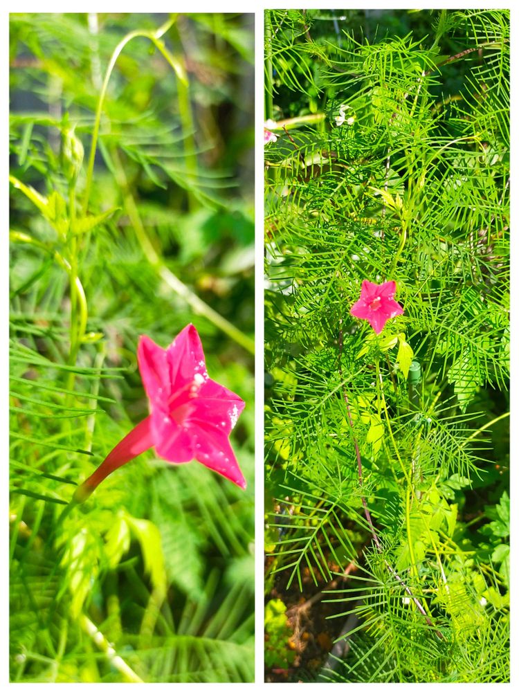 ルコウソウはようやく咲いてくれました❤️グリーンの葉に真っ赤な花、エキゾチックです。