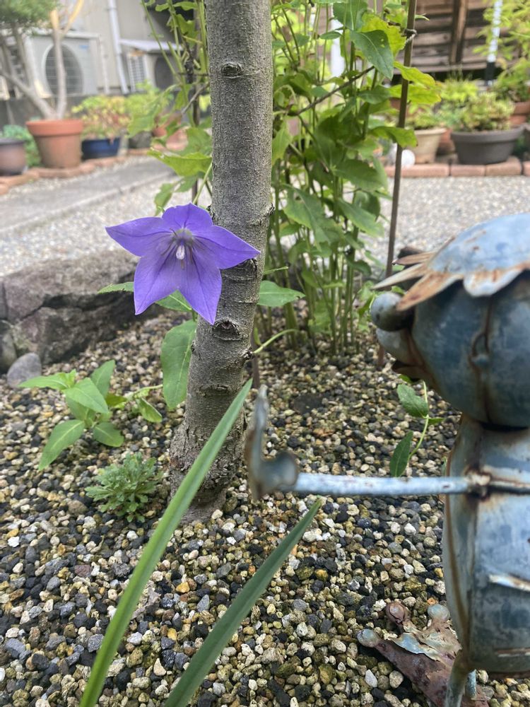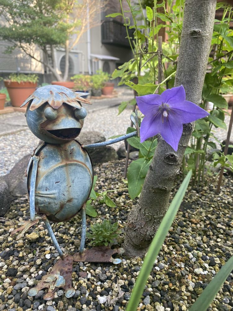 切り戻した桔梗が咲いています。さっき、今日の投稿用に撮っていたら、庭番サブリーダーのカッパ君が桔梗の様子を見にやってきました。ついでにボクも撮ってだって。はいはい😊