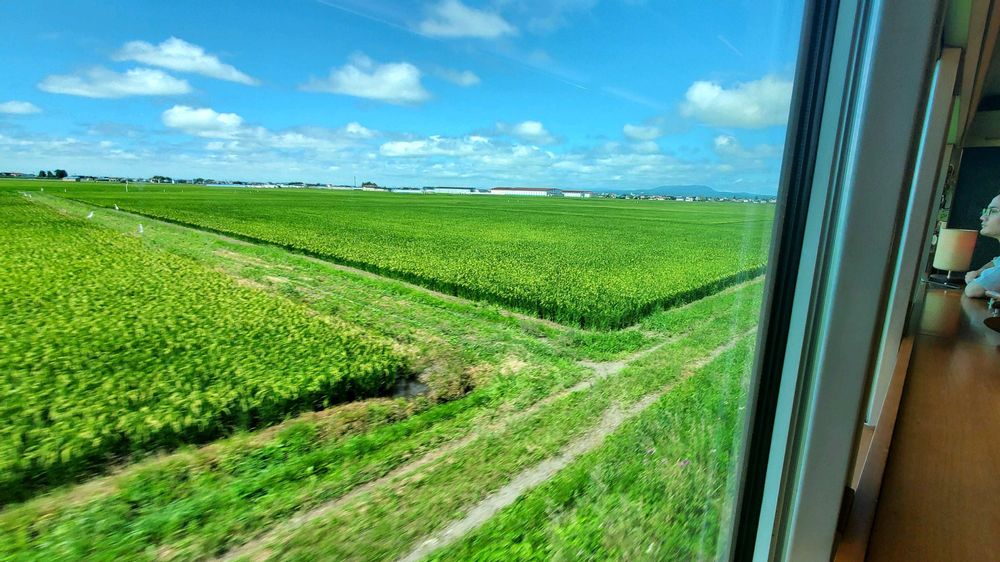 大きな窓から田園の景色。地元でも見慣れているはずなのに、なぜか新鮮に見えました