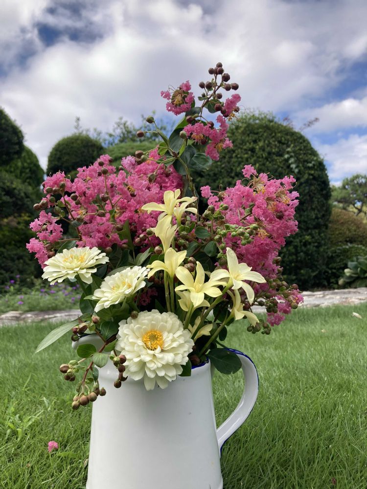 3️⃣お花が重たくなって、どうしても地面スレスレに咲いてるサルスベリと、あっちこっちから咲きだしたレインリリーに、白いジニアを添えて玄関に😃