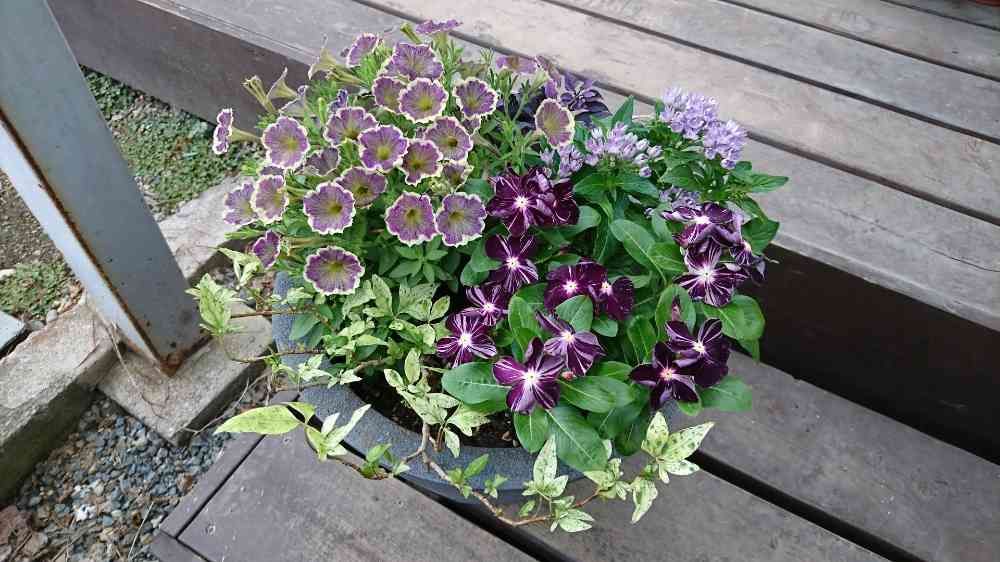 栄養系ペチュニア“プレミアムコレクション・カプリス”、ビンカ“藍染め絞り”、栄養系矮性ブルーペンタス“シリウス”、ヘデラ“白雪姫・雪の華”、トウガラシ“パープルフラッシュ”です。