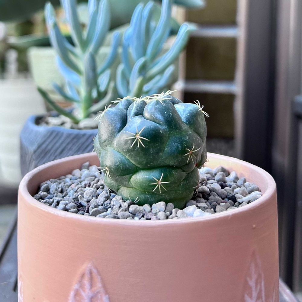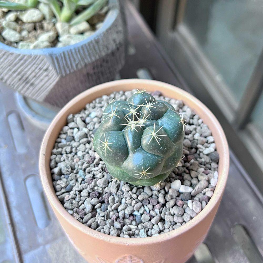 先日コメリで衝動買いしてしまった玉サボテン[象牙丸]を陶器鉢に植え替えました🌵孔雀石の塊の様なボディにまだまだ小さな棘が星のようでカワイイ。