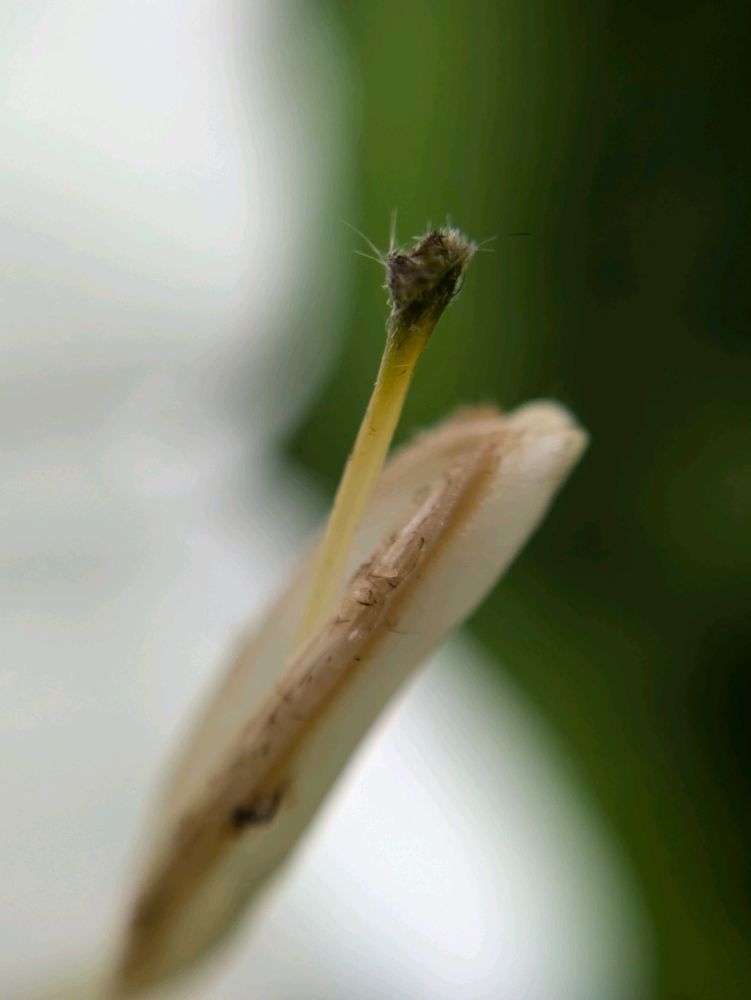 花糸が太くて花粉もよく目立つ雄しべが1本あって、その葯の先から緑色をした雌しべの柱頭が短く出ている(2、3、4枚目)
