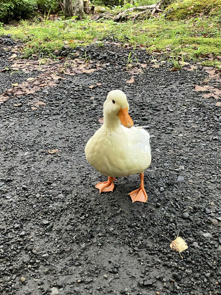 近くに釣り人の古い宿があり そこのお池から散歩?して来たようでした 人懐っこい可愛いアヒルでしたよ