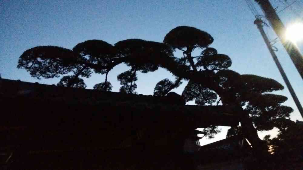 おはようございます。今朝は影絵を投稿します。5時前ようやく明け出しました東の空にきれいに剪定された松の木です。