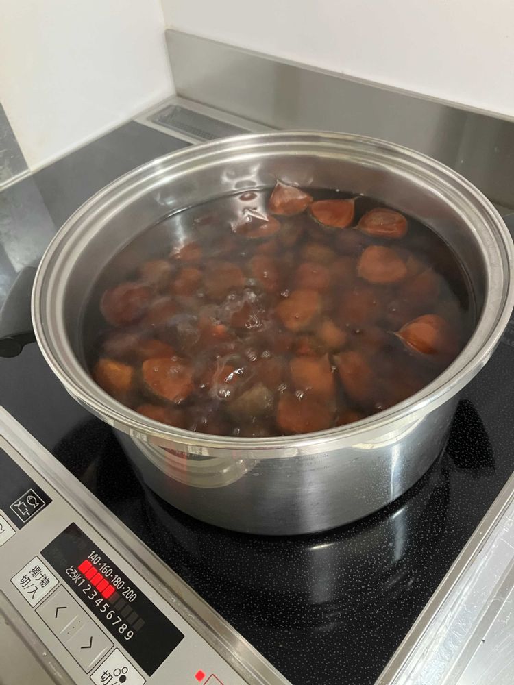 1️⃣生栗水洗いして鬼皮のまま鍋に入