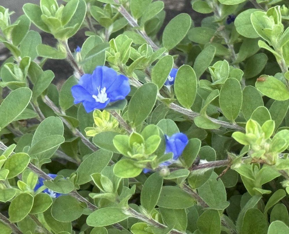エボルブルスは、アメリカンブルーとも呼ばれ、葉腋に花径2~3cmほどの濃い青色の花を咲かせます。高温乾燥に強く、夏の間旺盛に生育し、すがすがしい花色が涼しげです。曇りの日は花が閉じます。寒さには弱く、暖地であれば戸外で冬越しできますが、霜が降りるところでは枯れ、一年草として扱われます。分枝性のよい枝がほふくして四方に広がるので、花壇の縁取りやハンギングバスケット、脚つきのコンテナのほか、グラウンドカバーにも利用できます。花は枝の先のほうに咲くので、摘心や切り戻しをして枝数をふやしておくことが、こんもりとした草姿に花をたくさん咲かせるコツです。