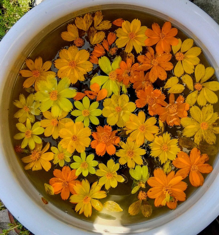 キバナコスモスがいっぱい咲いたので花手水にしてみました💛🧡💛