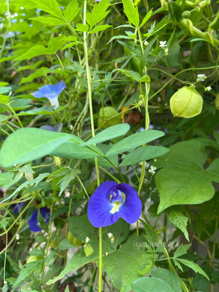 グリーンカーテンのバタフライピーと朝顔も涼しげ🩵