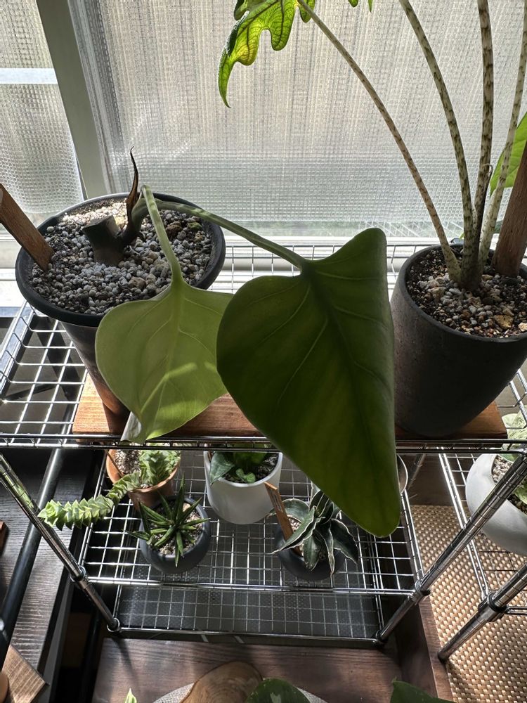 2025.8月に某サイトで購入した【アロカシア チャイ】の 突然変異?なんだろう 購入時、元々有った葉を(1枚目の葉)として、 下から新たな葉が出てきてる状態で到着しました(2枚目の葉) こちらに来て初めて出てきた葉に異変が。。 育て始めて出てきた初めての3枚目、4枚目 (途中から、斑1、斑2、、と続きます) どこまでこの謎の斑入葉が続くのか、 いや止まるのか……記録していきます