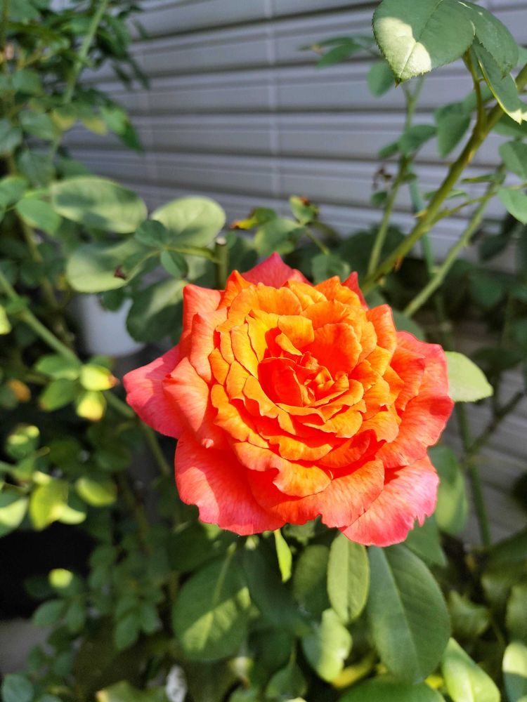このバラは春は淡いオレンジ色の花を咲かせます。夏は燃えさかる炎のようなオレンジ色です。花枝のトゲは少なく、花持ちも良い品種です。