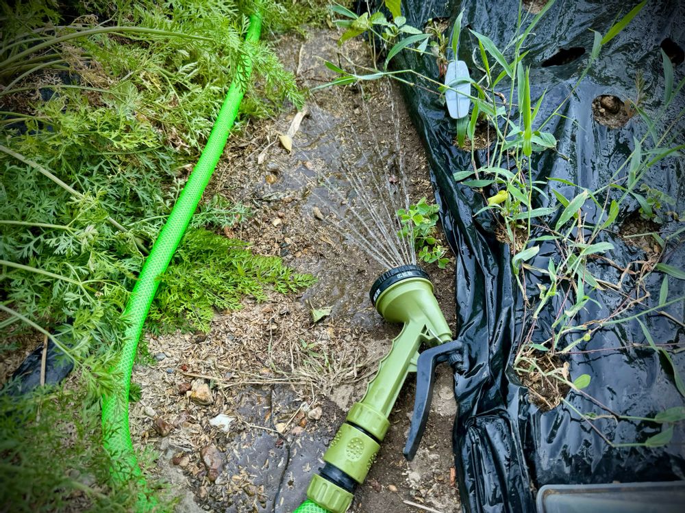 ポンプにホースを繋いで畑作業中ずっと導水してます。