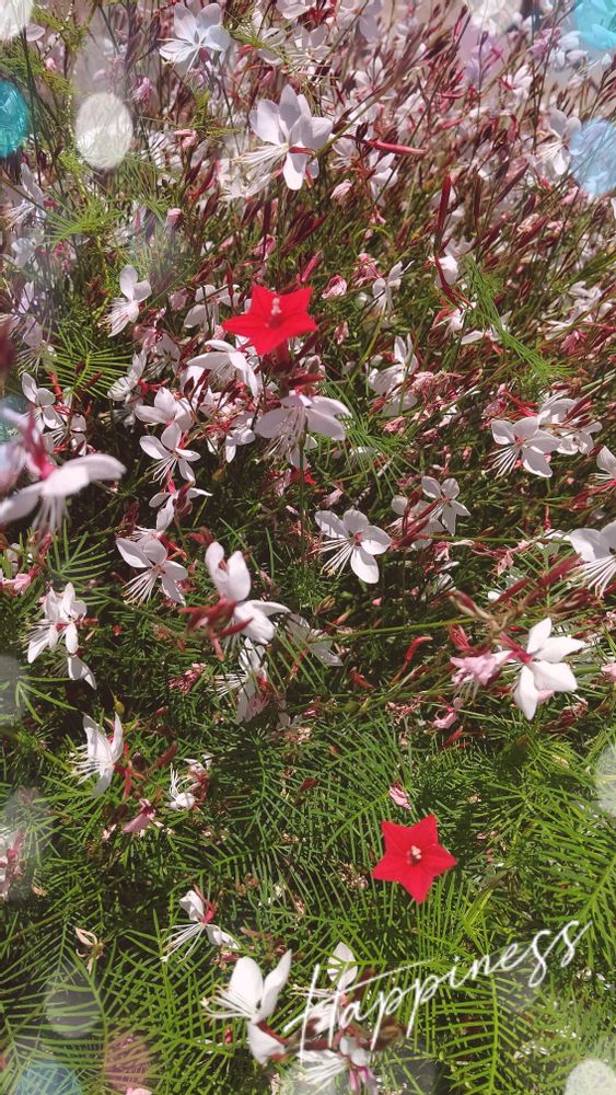 伸びきってピョンピョンしてたガウラさんを✂️カットしたら、こんもりイイ感じに咲いてました💗その中に真っ赤なルコウソウがポツポツ咲いてます🎵