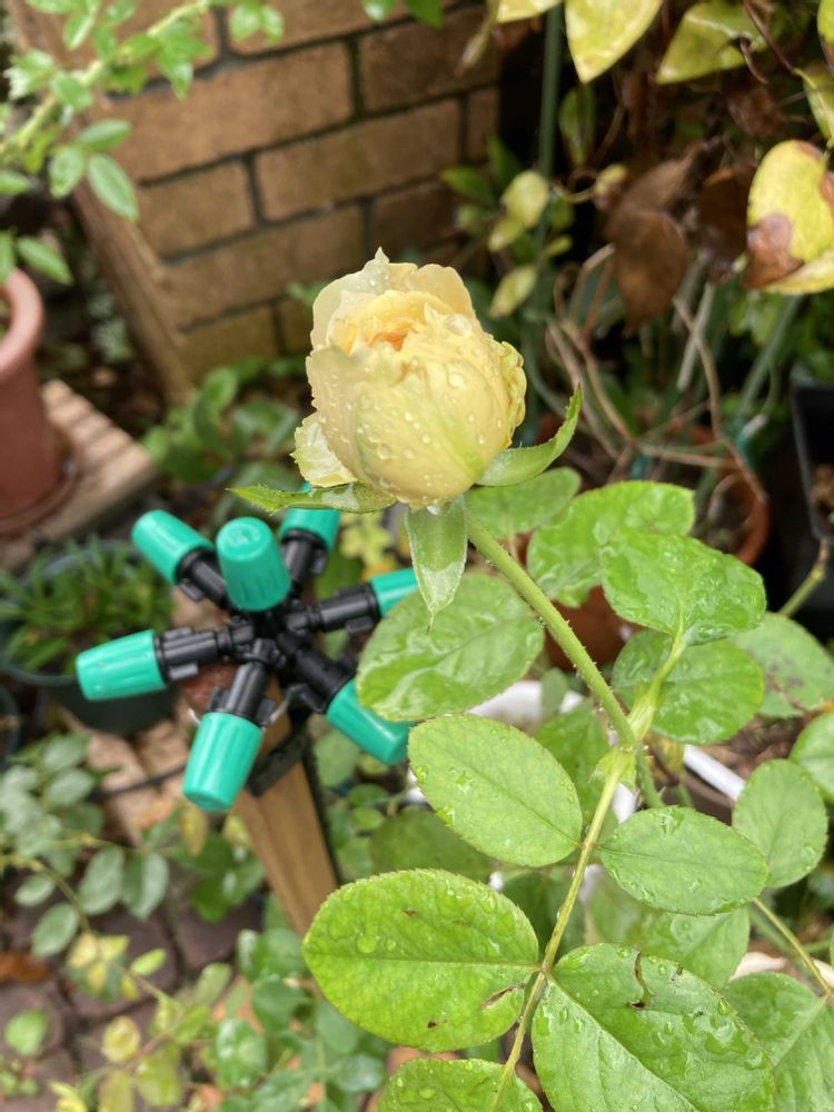 今日のお花の菊を探してお庭に出たら、まだ5枚目の硬いつぼみしかありませんでした‼️でも朝露(昨夜の雷雨)を帯びたお花が見られて良かった❣️3枚目の薔薇は噂の⁉️自動散水機と一緒に‼️おまけの4枚目は、どんどん株分かれして来たエアープランツです⁉️嬉しい☺️
