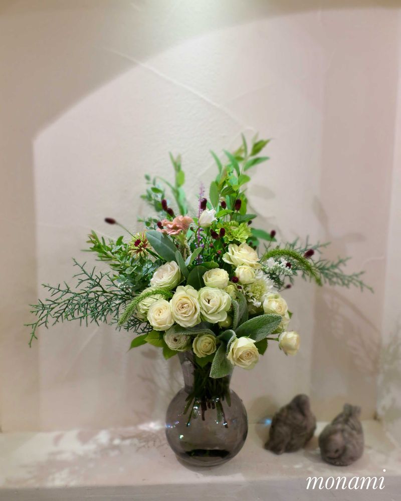 クリーミーなバラと吾亦紅の深い赤と葉っぱの緑💚素敵ですね❤️