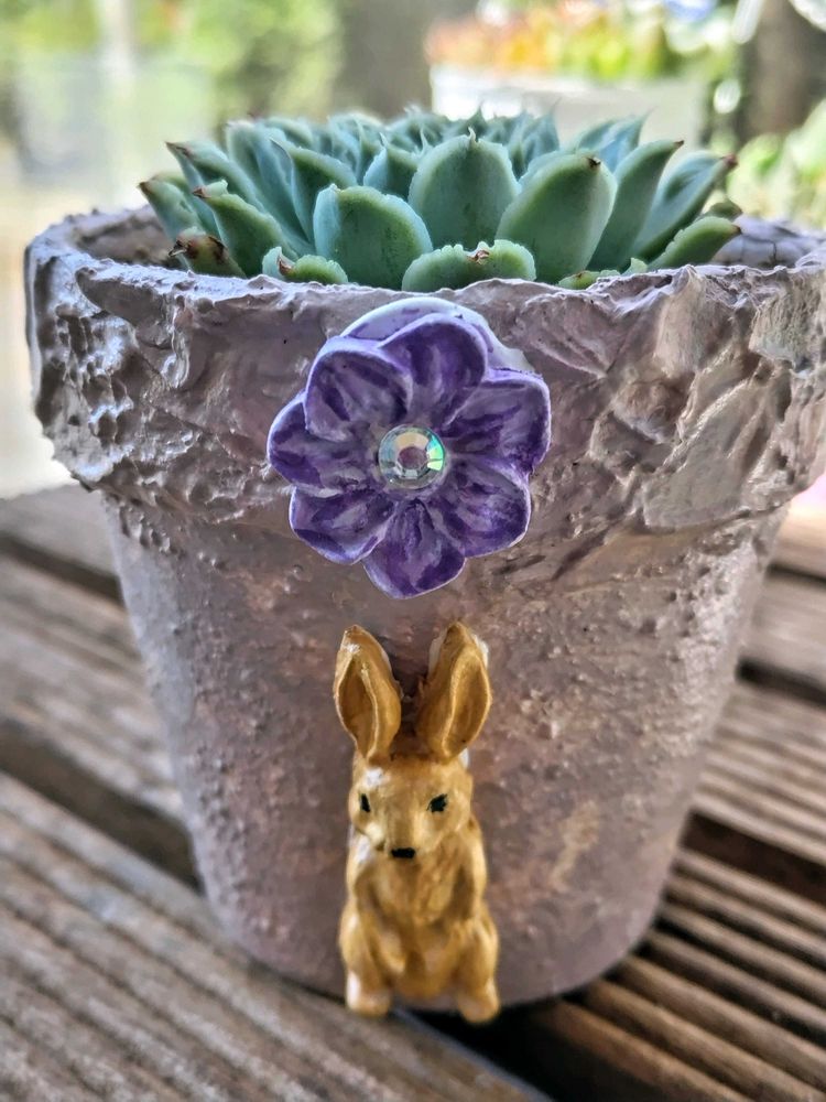 ロイラビ鉢、お花にピントが合うとうさぎがボケて、うさぎにピントが合うとお花がボケちゃって何度も撮り直しました…😅