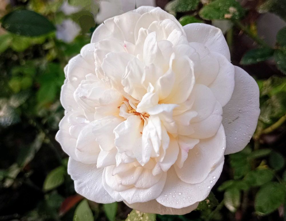 ✤こちら🤍「レッチフィールドエンジェル」も、🍀花友さんより🌱ですが、夏の陽射しいっぱい浴び☀ 春の淡〜く薄ベージュ色は消え白花。…でも暑さにも負けずこの1輪、これで1週間くらい咲いてくれてますョ〜👌💕