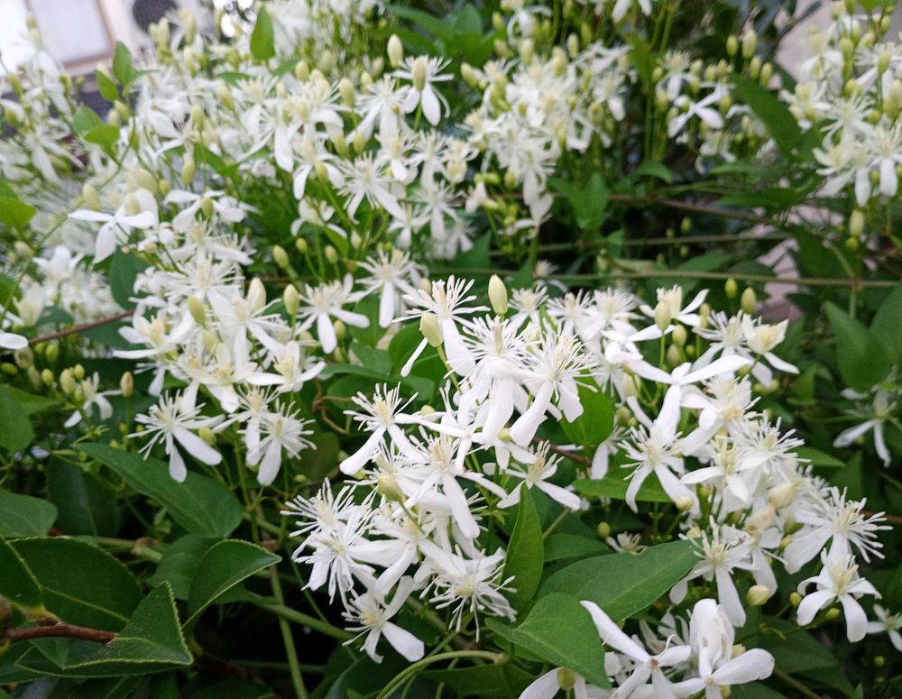 ✤裏庭、山茶花🌳の仙人草も また一層開花し、2m弱の🌳上部は白く 雪景色のよう❄🌳💮に。