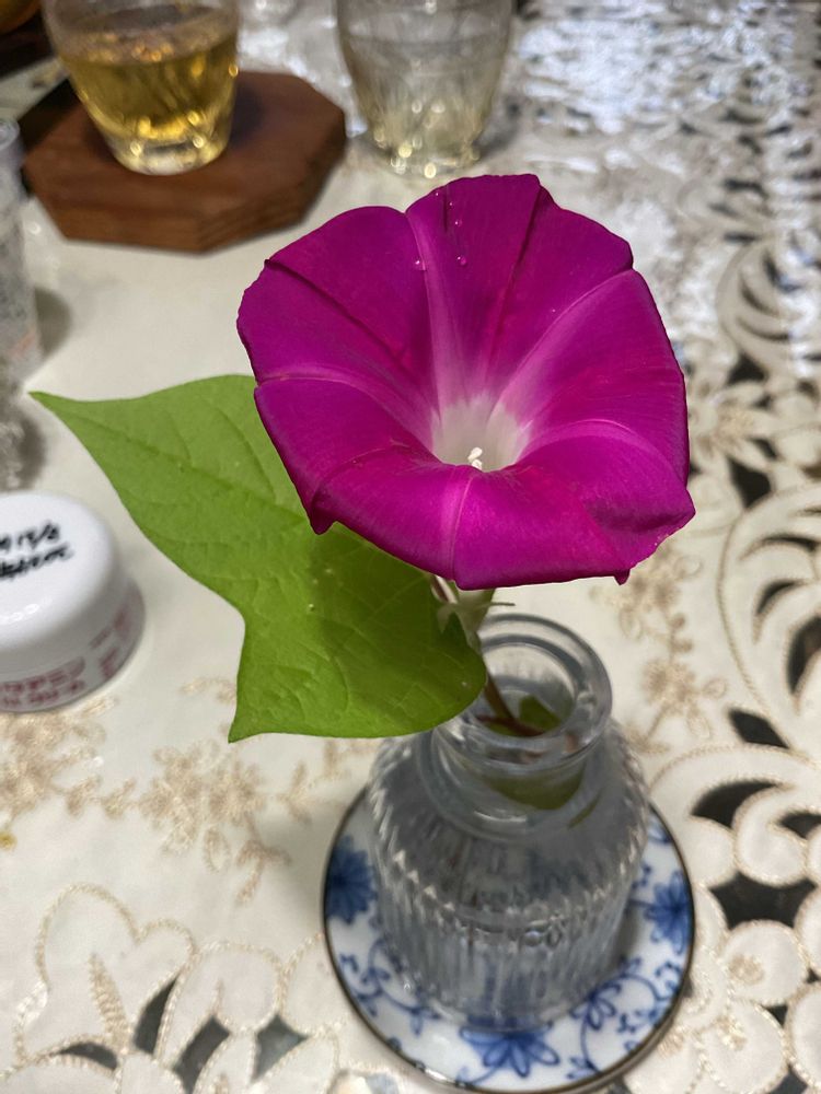昨日 朝☀️、主人が 新聞🗞️取って来て、庭から 朝顔🌺を 採ってきて 生けてくれました〜❗️