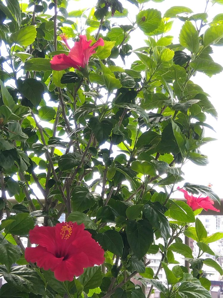 元気に真っ赤に咲く花にパワーを貰い空を見上げ癒されています