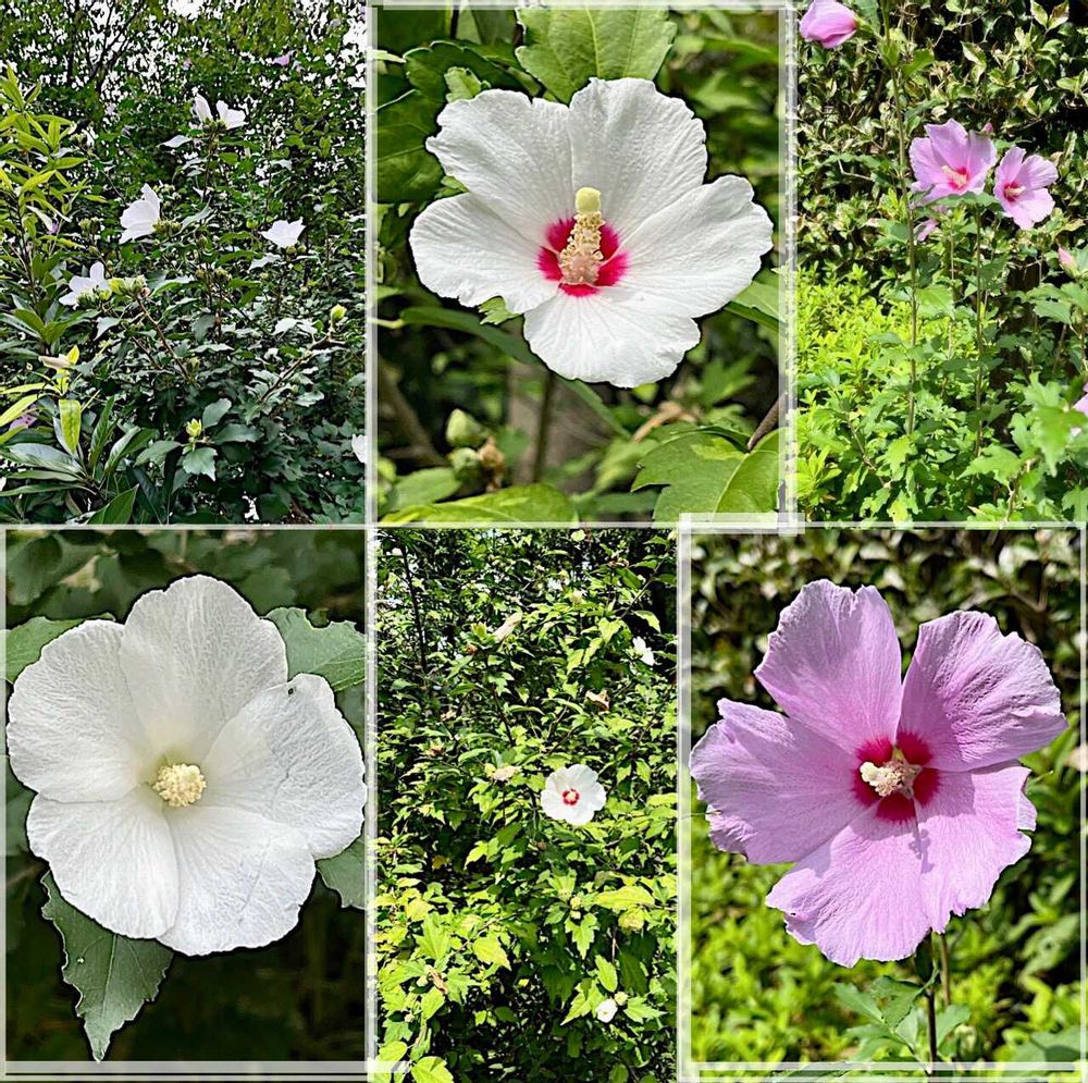 ムクゲ(木槿),/純白の•純白に赤の•紫に赤の、不離一体に咲かせる花木3つ/の投稿画像