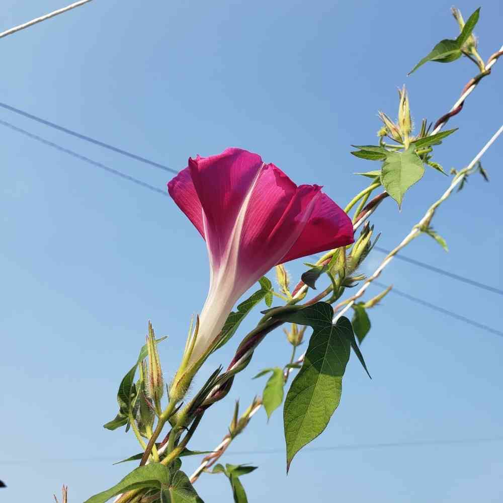 たまには空を撮影してみようかな、と思ったら植物を持ち上げたりせずに写せるのは朝顔だけでした(with電線)