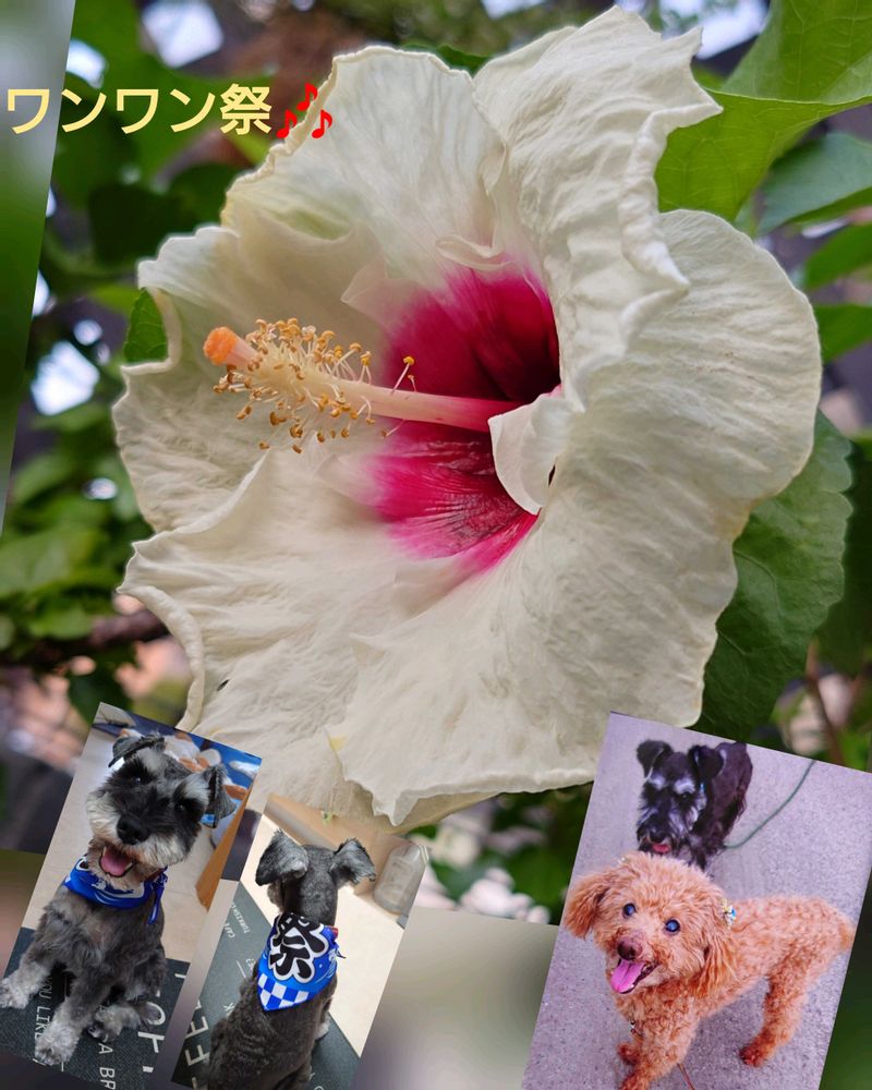 おはようございます🎵久しぶりに咲いてくれたハイビスカス🌺マドンナ🩷3年前くらいのミントとコタロー😊左はトリミング行き祭のバンダナつけてもらった毎日元気いっぱいなコタロー💖ワンワン祭りに参加します🤗